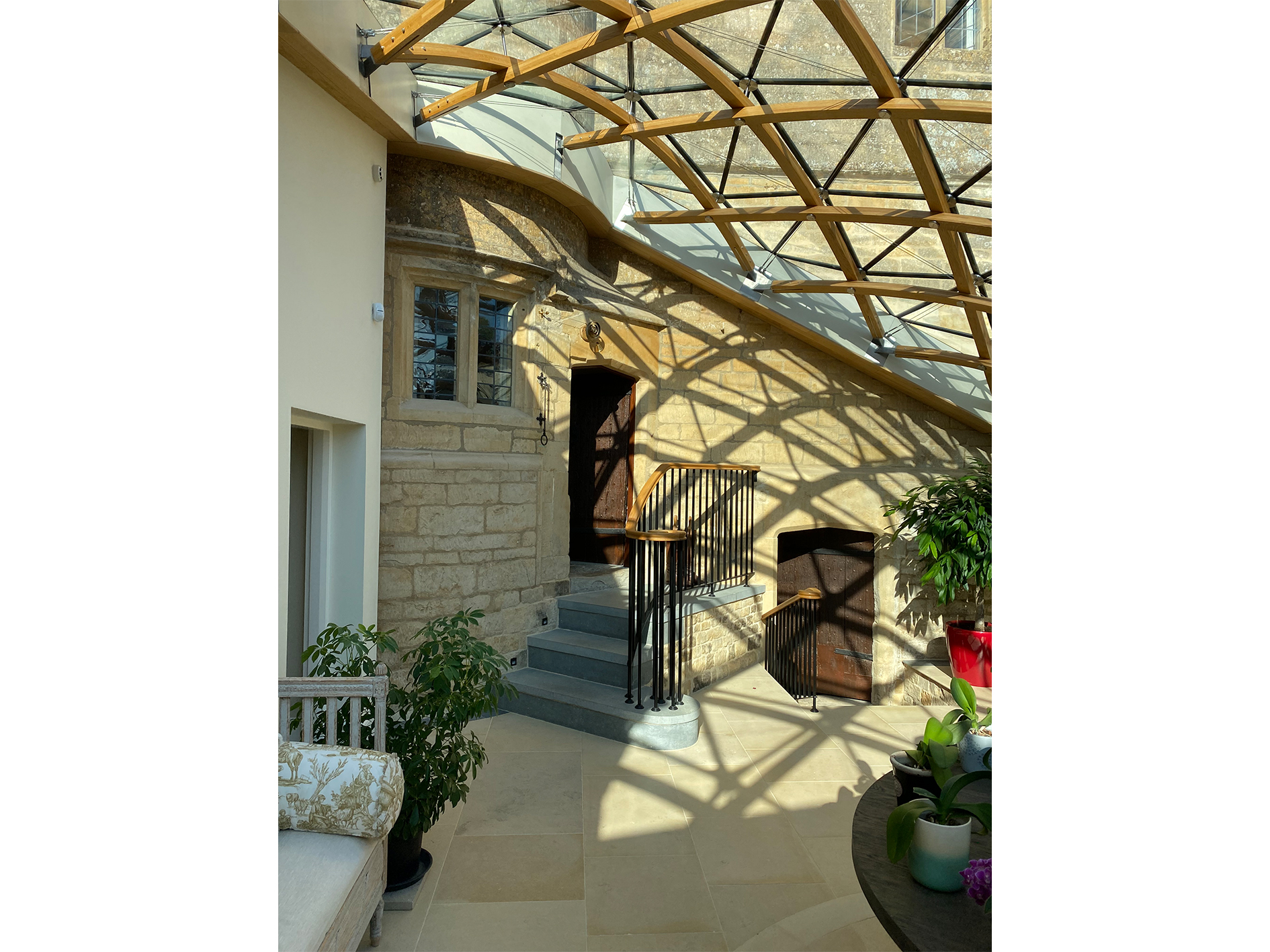 Following re-assembly on site, the gutters and flashings were completed by Mouldings, and the structure was glazed by IPIG with individually cut double-glazed units.