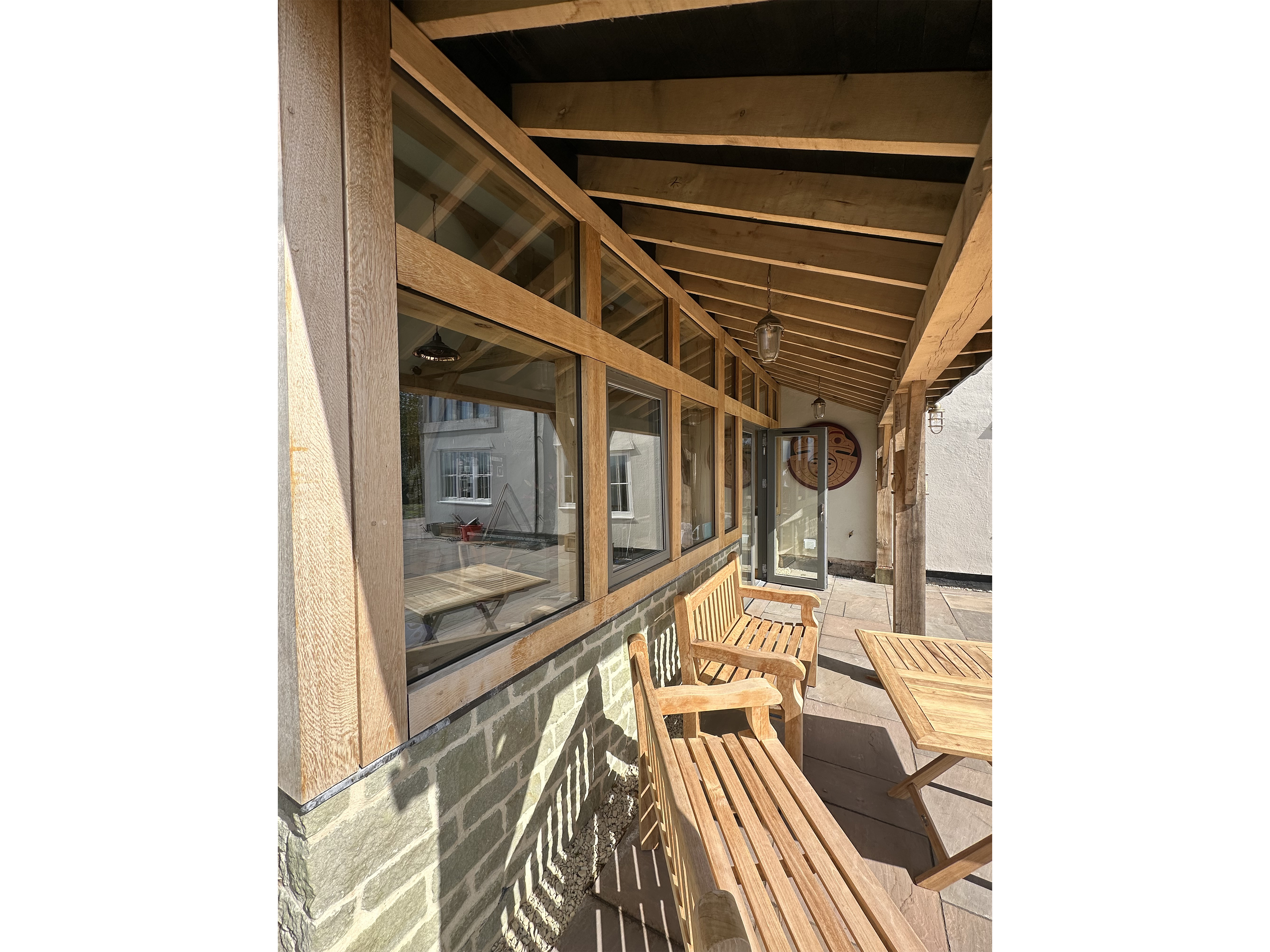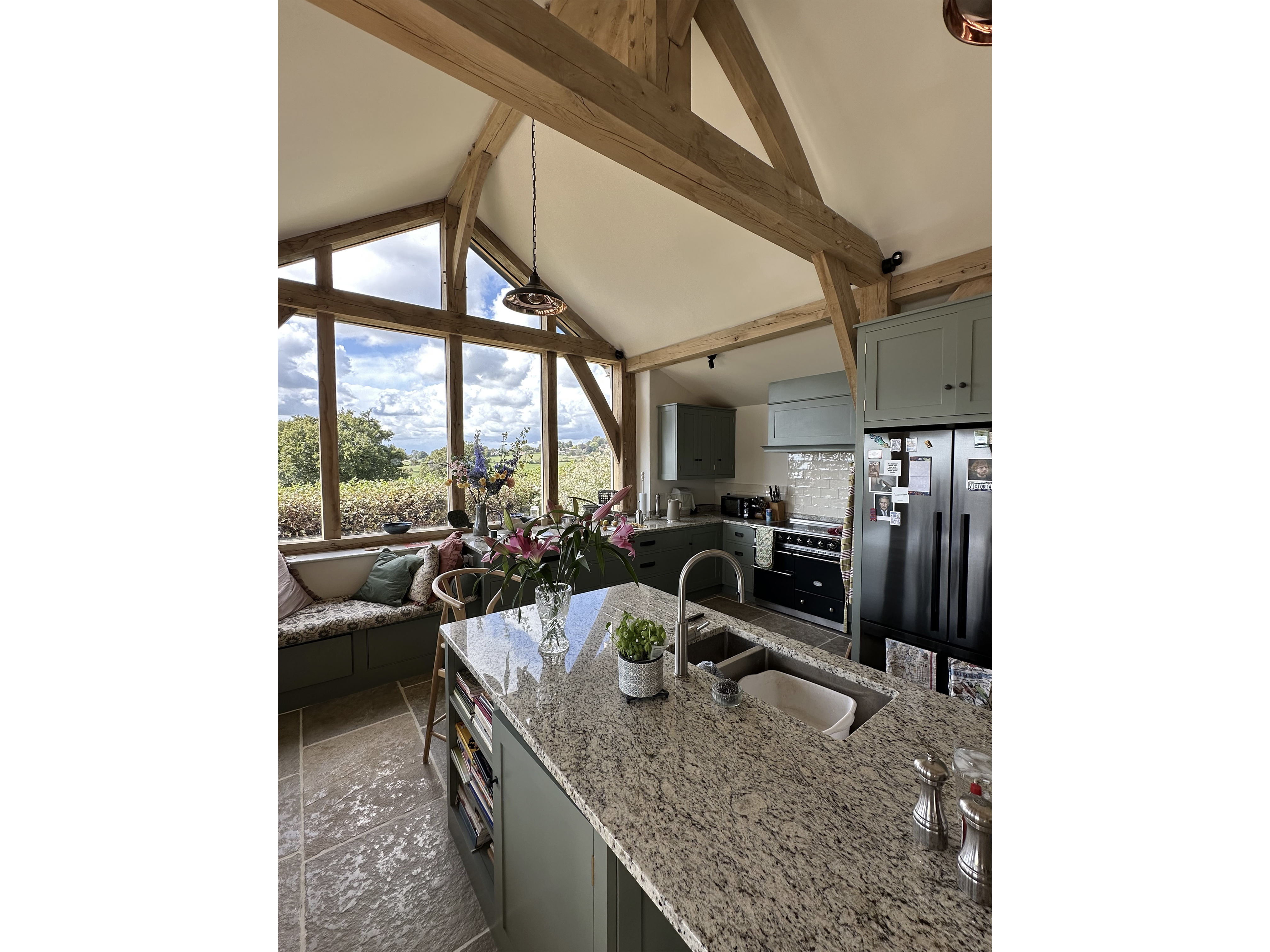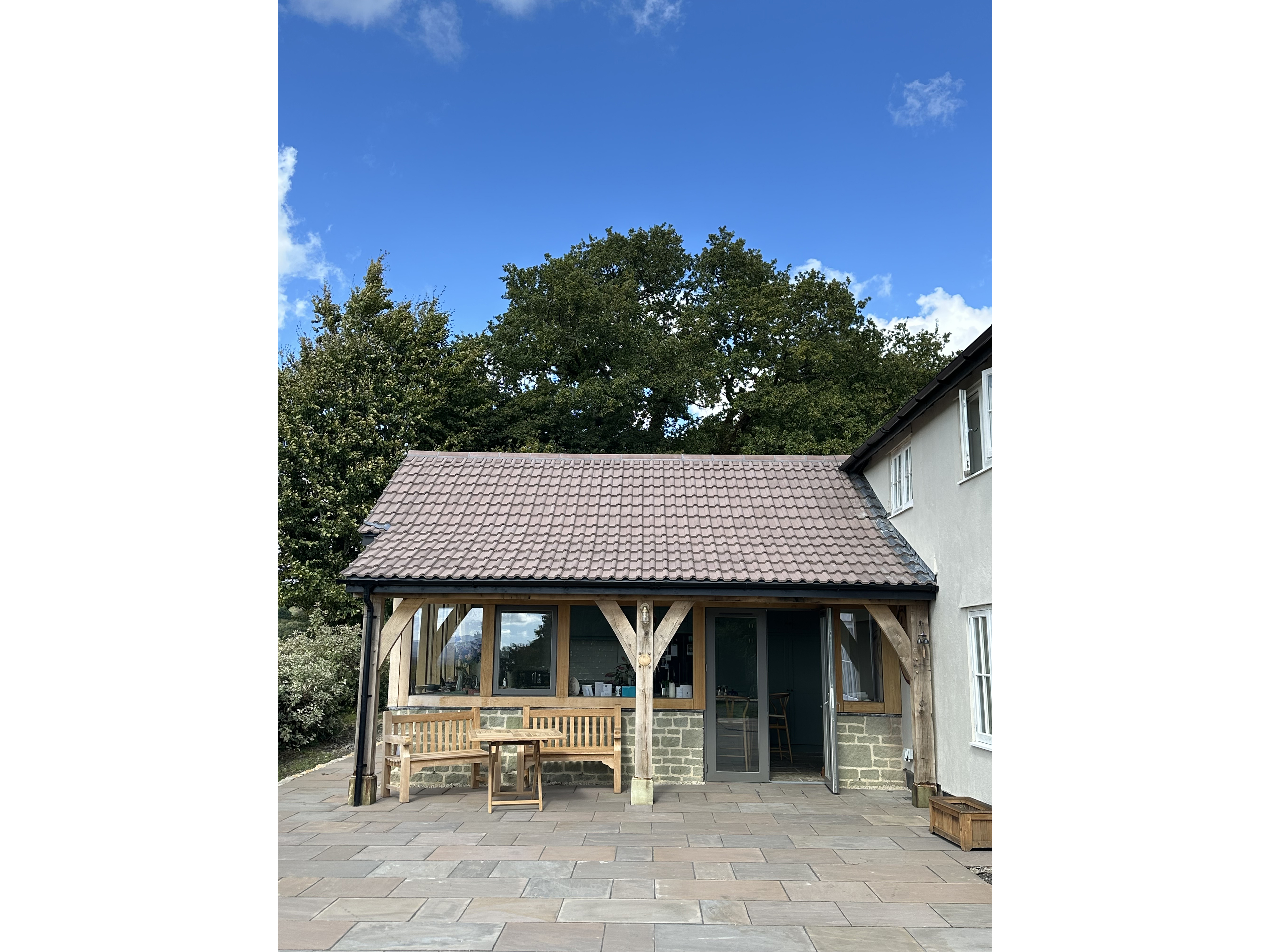 This project involved a single-storey oak framed kitchen extension to a traditional masonry cottage, blending classic materials with modern functionality. The new space creates a light-filled kitchen area, along with utility and cloakroom. The roof is finished in interlocking tiles to match the existing cottage, ensuring a harmonious appearance. To the south of the property, an oak-framed porch was constructed creating a warm and characterful entrance.
