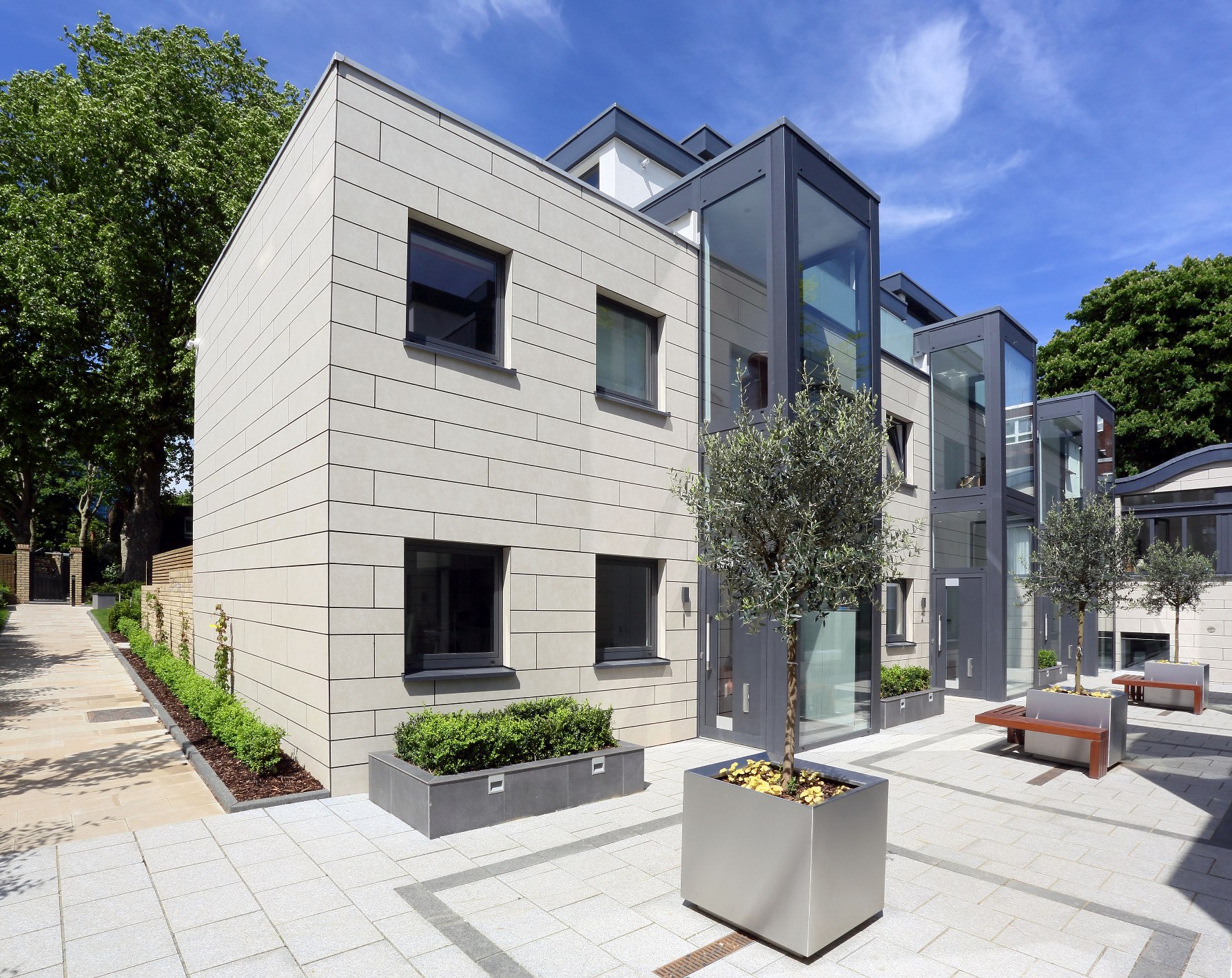 The development consists of 20 no. 4-storey houses with basement parking and communal areas, resulting in a tight but pleasant layout.